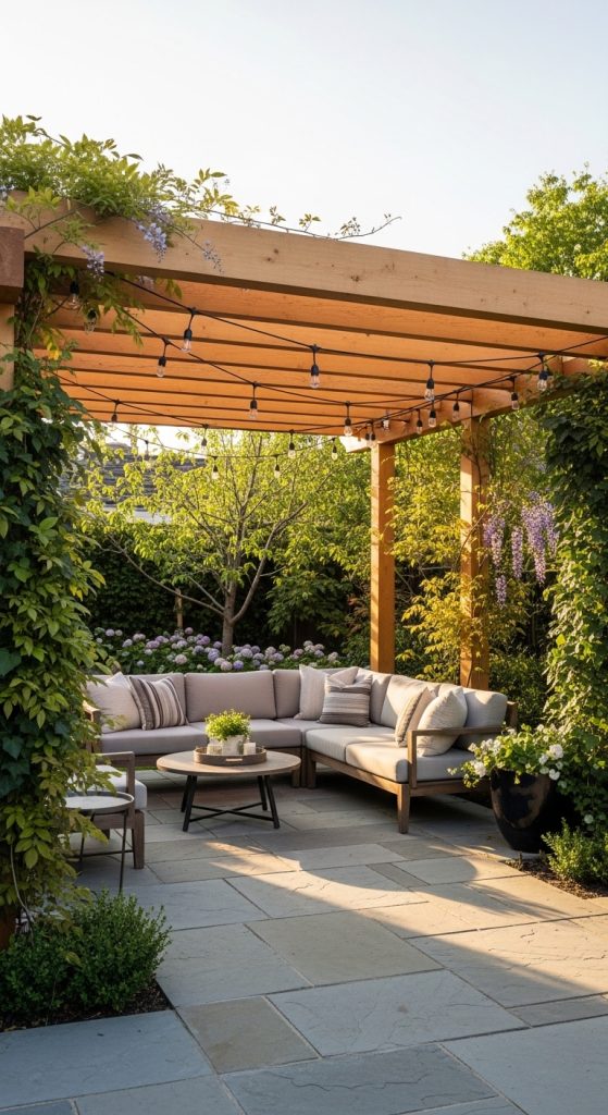 A pergola shade structure provides both aesthetic and functional value in back patio decorating. It creates a defined outdoor space while offering partial shade and architectural interest. This idea is widely used in Pinterest ideas because it adds structure and elegance to open patios. The design allows for integration of lighting, plants, and seating within a framed environment. It enhances both comfort and visual appeal, making the patio feel like an outdoor room.