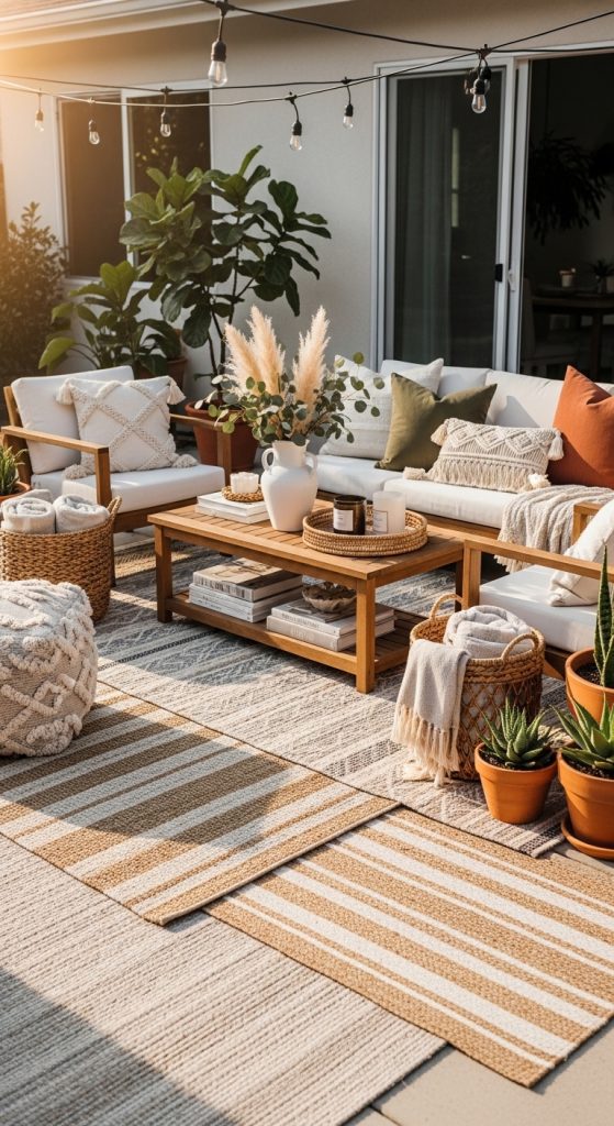 A textured rug layered design adds depth and warmth to a back patio by introducing fabric-based elements into outdoor styling. This idea is popular in Pinterest inspiration because it enhances comfort and visual structure without requiring major construction. Rugs help define different zones within a patio, such as seating or relaxation areas. Layering multiple textures creates dimension and adds a cozy aesthetic that softens hard outdoor surfaces. This approach works well in both modern design and minimalist style patios, depending on color and pattern selection.