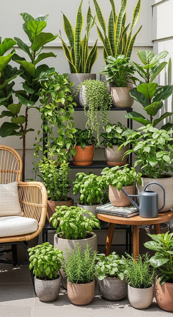 A green plant corner arrangement focuses on using plants to create a natural and refreshing patio atmosphere. This idea is frequently seen in Pinterest ideas due to its simplicity and strong visual impact. Plants bring life, texture, and color into outdoor spaces, making them feel more inviting. This setup works well in small and large patios alike and supports minimalist and natural design themes.