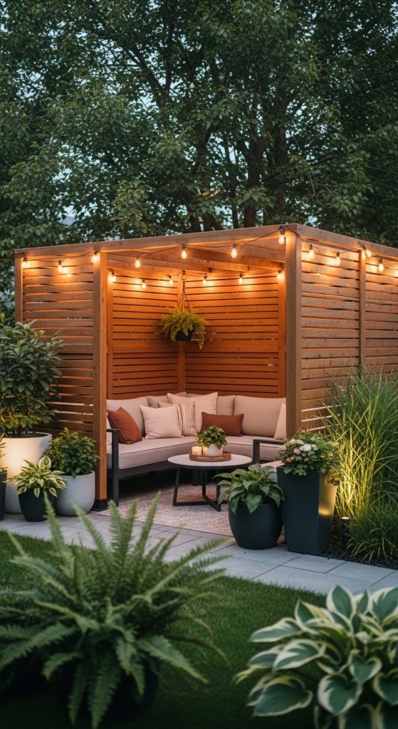 A privacy screen design enhances comfort by creating separation from surrounding areas. This idea is widely used in Pinterest ideas for outdoor living because it improves intimacy and usability. Screens can be made from panels, plants, or decorative partitions.