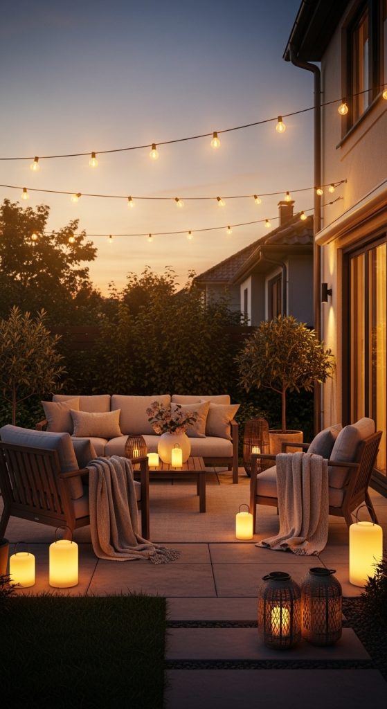 Warm lighting is one of the most effective ways to transform a simple back patio into a welcoming and visually appealing outdoor space. This idea focuses on creating a soft and balanced glow that enhances the atmosphere during evening hours. Lighting plays a central role in shaping mood, and when used correctly, it can make even small patios feel spacious and comfortable. The key concept behind this design is layering different light sources to avoid harsh brightness while maintaining visibility. Soft illumination helps create a relaxed environment suitable for gatherings, reading, or quiet outdoor evenings. In Pinterest ideas for outdoor styling, lighting is often considered the foundation of aesthetic transformation because it enhances all other decorative elements. Whether the patio is designed in a modern design style or a more natural handmade setup, lighting brings cohesion and warmth to the entire space.