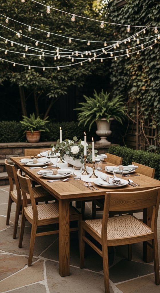 An outdoor dining setup transforms a back patio into a functional eating and entertaining space. This idea is commonly featured in Pinterest ideas because it extends indoor dining experiences into open-air environments. The design focuses on creating a structured dining zone that is both practical and visually appealing. It often includes a central table surrounded by coordinated seating, arranged in a way that encourages shared meals and social interaction. This setup works well for family gatherings, casual meals, or special occasions. The style can vary from minimalist arrangements to more detailed decorative themes depending on personal preference.
