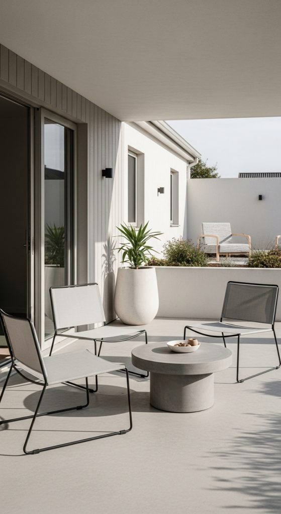 A minimalist seating arrangement focuses on simplicity, clean structure, and functional use of space. This design approach is widely featured in Pinterest ideas because it creates a calm and organized outdoor environment without unnecessary clutter. The concept emphasizes open space, neutral tones, and carefully selected furniture pieces that serve both comfort and practicality. Instead of overcrowding the patio, the focus is on a few essential seating elements arranged in a balanced layout. This creates a modern design feel that is easy to maintain and visually appealing. Minimalist patios are especially suitable for small outdoor areas where efficient use of space is important. The style also supports budget ideas because it reduces the need for excessive decoration and instead focuses on intentional placement of key elements.