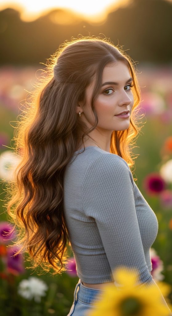 Half-up waves combine structured styling with relaxed flow, making them a popular Pinterest hairstyle idea. This look involves pulling the upper section of the hair away from the face while allowing the remaining waves to fall freely. It creates a balanced appearance that works well for both casual and semi-formal settings. The style is especially effective for medium-length hair and adds a youthful, soft aesthetic.