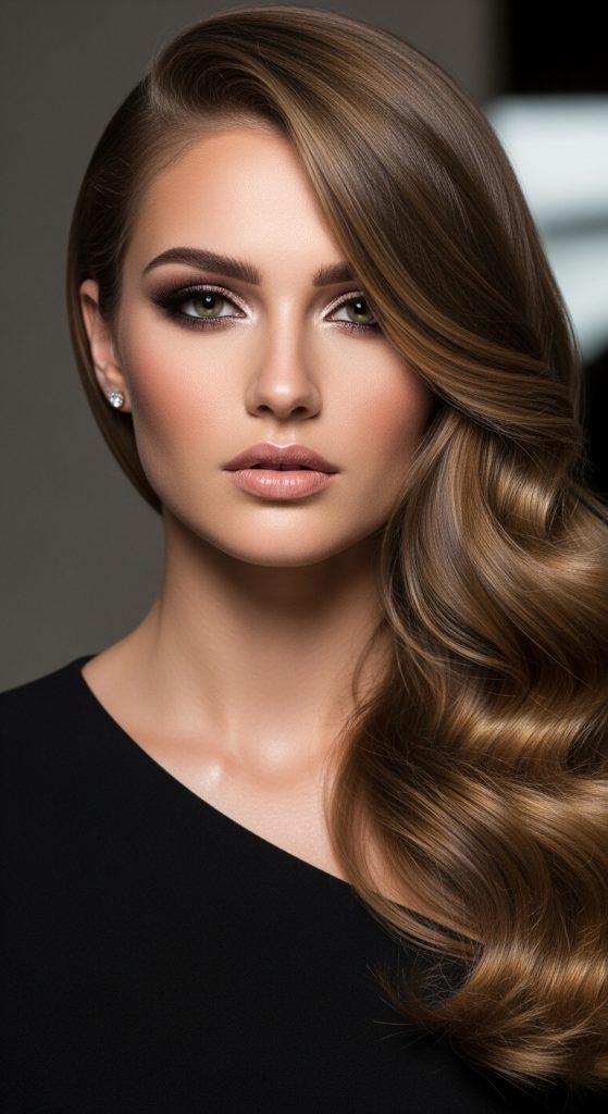 Side-swept waves offer a refined and elegant hairstyle that emphasizes asymmetry and flow. This look is popular for formal occasions and aesthetic inspiration boards due to its graceful shape. The waves are directed to one side, creating a soft framing effect around the face. It adds sophistication while maintaining natural movement.