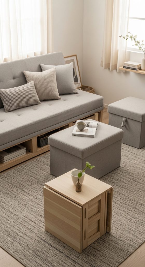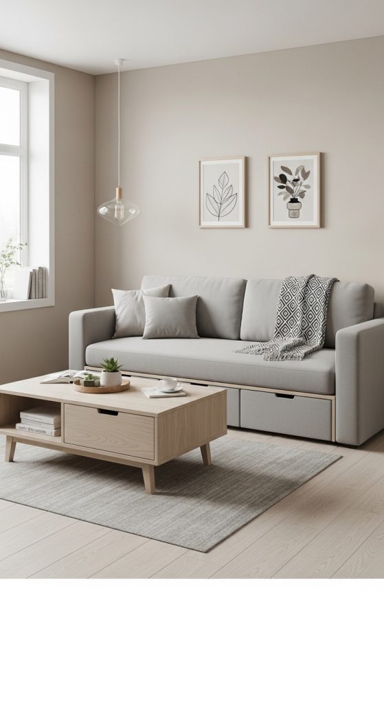 Multi functional furniture is a core concept in small living room design because it combines usability with space efficiency. Instead of using separate furniture pieces for storage, seating, and decoration, this idea focuses on combining functions into single units. It is one of the most practical Pinterest ideas for modern homes because it reduces clutter while maintaining comfort. Examples include seating with hidden storage, foldable tables, and modular seating arrangements. This approach supports minimalist style living and enhances room flexibility.