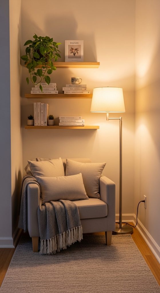 To create this setup, identify underused corners and determine their potential function. Install corner shelves or place compact furniture that fits naturally into the space. Materials include shelving units, cushions, and small lighting fixtures. The setup process involves measuring corner angles and selecting appropriately sized elements. Ensure that the arrangement does not block movement flow. This method is especially useful for beginner friendly DIY projects because it requires minimal tools and delivers immediate improvement in room structure and usability.
