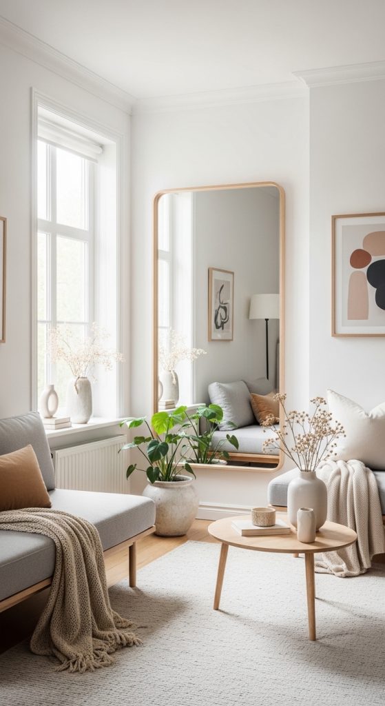 To create this effect, position mirrors opposite windows or light sources. Choose simple frames that match the roomโ€™s minimalist style. Materials include wall mirrors and secure mounting tools. The installation process focuses on strategic placement rather than quantity. Avoid excessive mirror use to maintain balance. This method is a powerful DIY solution for enhancing spatial perception.