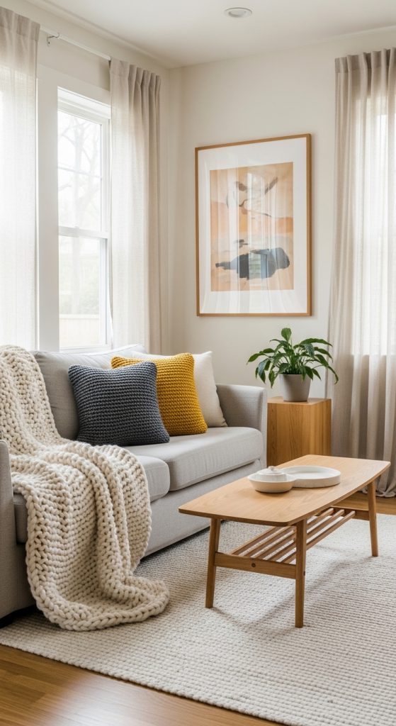 To create this effect, combine soft textiles, smooth surfaces, and natural elements. Materials include cushions, rugs, and decorative fabrics. The arrangement process focuses on contrast balance rather than excess decoration. This method is ideal for handmade decoration and DIY styling projects.