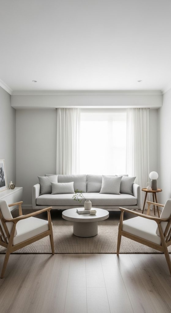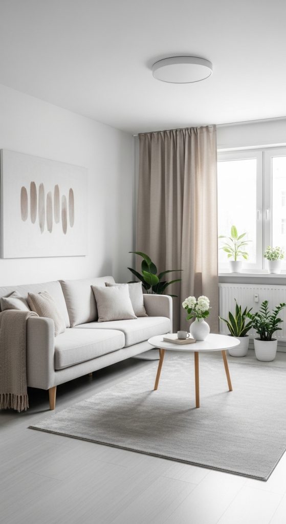 Minimalist color coordination focuses on using a limited color palette to create harmony in a small living room. This concept is central to modern design because it reduces visual clutter and creates a unified aesthetic. Neutral tones, soft contrasts, and balanced shades help maintain a calm and organized atmosphere. This approach is often associated with minimalist style and budget ideas because it relies on color planning rather than expensive decoration.