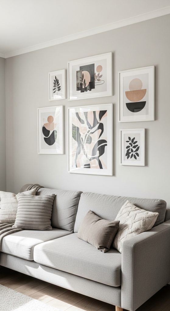 To create this design, start by selecting a central wall area and arranging artwork in a structured composition. Mix different frame sizes while maintaining alignment balance. Materials include wall hooks, frames, and decorative prints. The installation process involves planning layout symmetry before placement. Avoid overcrowding the wall to maintain a clean modern design appearance. This technique supports DIY creativity and allows personalization through handmade or budget-friendly decorative elements.