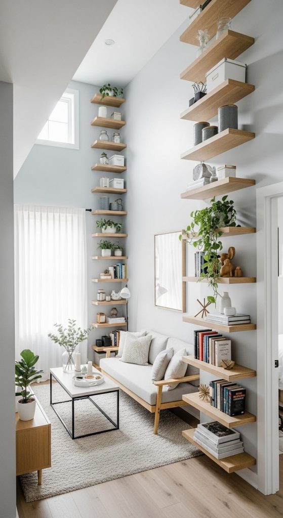 Vertical wall maximization focuses on using upward space instead of spreading items horizontally. In small living rooms, floor space is limited, so walls become essential for both storage and decoration. This concept is widely used in modern home decor because it creates an illusion of height and openness. It allows the room to feel less crowded while providing functional storage areas. Vertical arrangements also support minimalist style by keeping the floor clear and organized. This approach can include shelves, wall mounted frames, and elevated storage units that draw the eye upward, creating a more spacious environment.