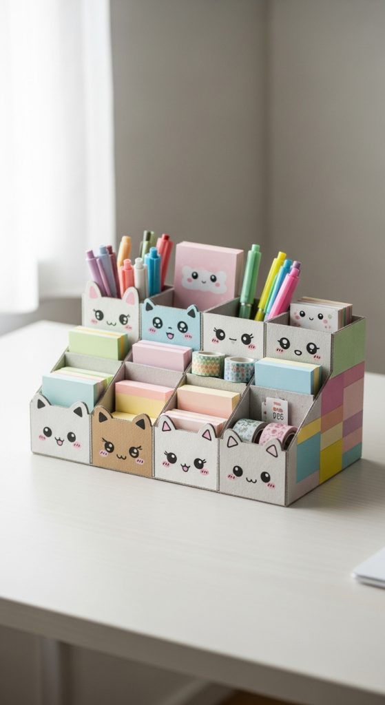 To create them, use cardboard or small containers as base structures. Divide sections for pens, notes, and small items. Cover the surface with pastel paper and add kawaii decorations such as faces or stickers. Materials include cardboard, glue, decorative paper, and markers. The step by step process involves structuring, covering, and decorating. This DIY project is beginner friendly and supports budget ideas while improving organization.