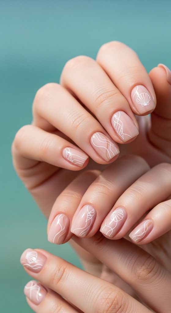 Once completed, minimal shell line art nails offer a refined coastal aesthetic that fits well with modern neutral beach nails trends and DIY nail inspiration boards.
