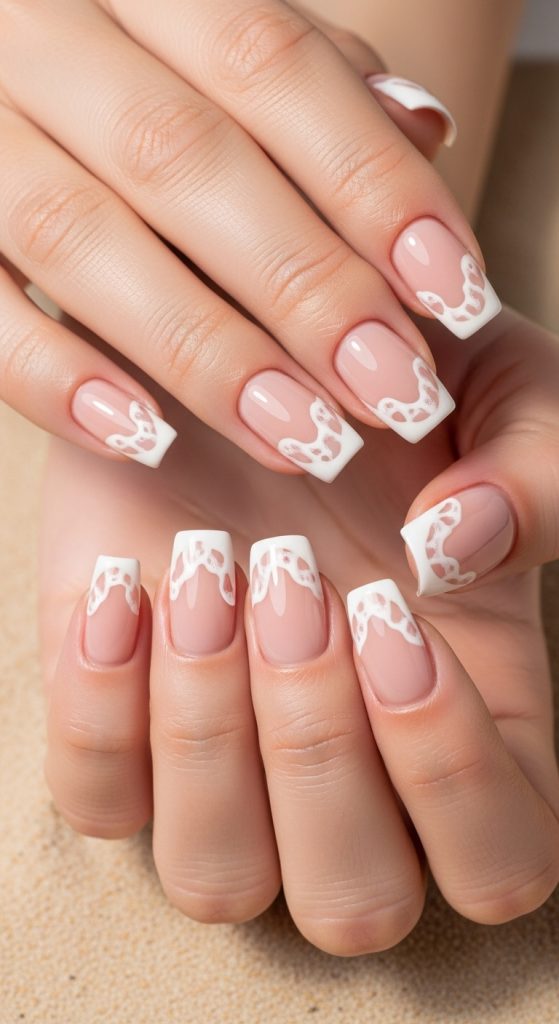 Ocean foam white tip nails are inspired by the gentle movement of sea foam along the shoreline. This design combines a neutral base with soft white tips that resemble natural wave patterns. It is a modern variation of classic French nails, adapted for beach-themed inspiration. The soft contrast between nude and white creates a clean and refreshing aesthetic that fits perfectly into Pinterest ideas focused on minimal design.