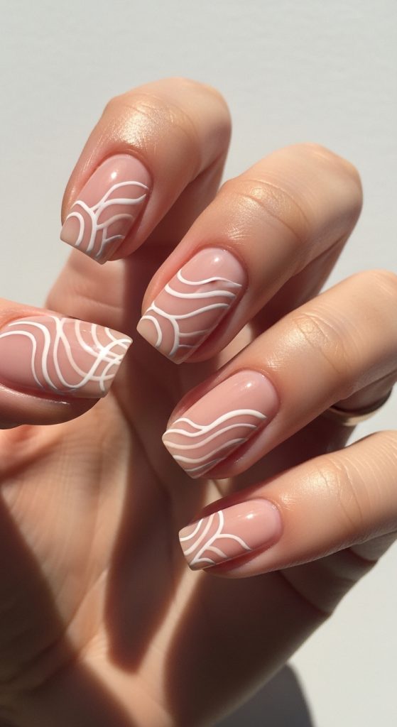 Apply a nude base coat and use a fine brush to draw wave-like curves in white or light beige. The lines should flow naturally across the nail without strict symmetry. This creates a dynamic yet soft visual effect.