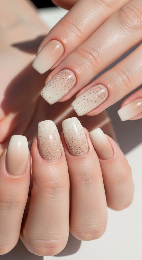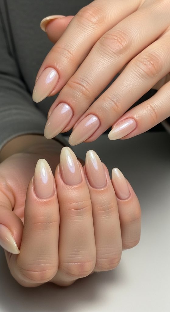 To create this look, apply a neutral base color followed by a pearl-effect top coat or fine shimmer layer. The key is to maintain subtlety rather than strong glitter. This ensures the nails retain a natural and soft appearance. The process is simple and suitable for beginners exploring creative nail ideas.