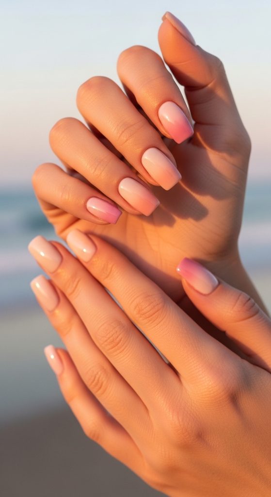 After achieving the desired gradient, refining the edges is important. A small brush dipped in nail polish remover can clean excess polish around the nail bed for a professional finish. Sealing the design with a top coat enhances durability and adds shine or matte texture depending on the chosen style. This nail idea is ideal for those who prefer minimalist style with subtle detail, making it a strong example of modern neutral beach nails.