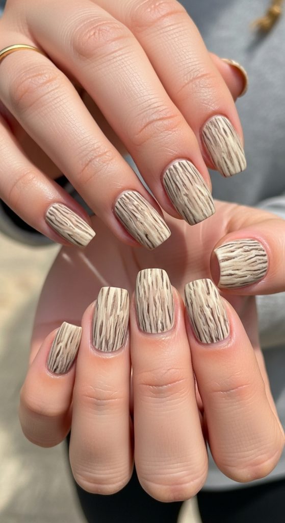Driftwood texture nails mimic natural wood patterns found along beaches. This design uses layered neutral tones to create subtle grain effects.