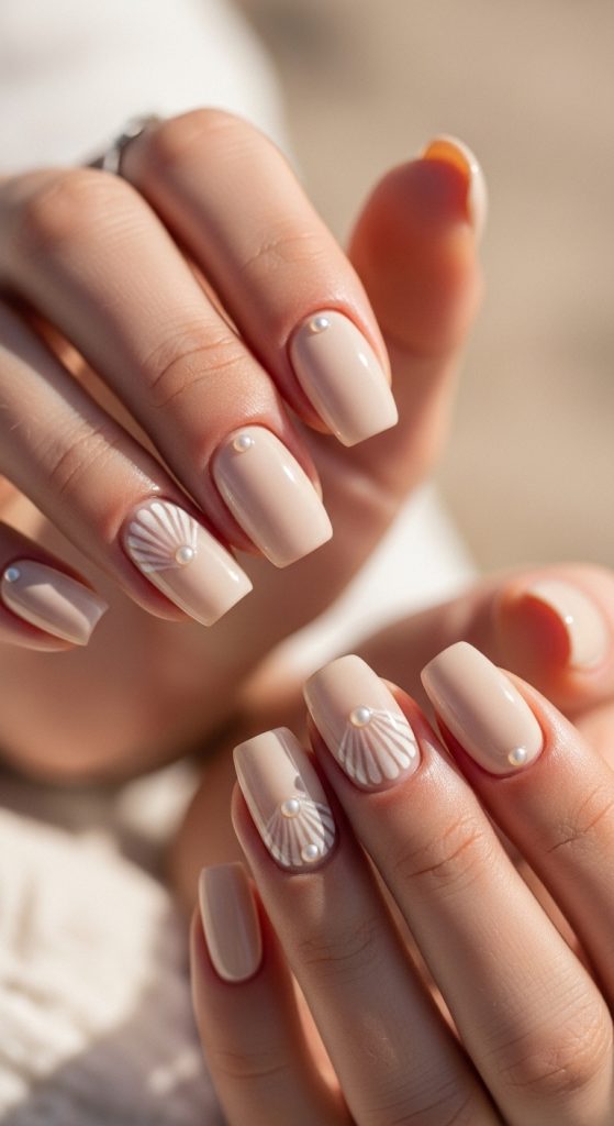 To create this look, apply a neutral base color across all nails and allow it to dry completely. For accent nails, use a fine brush or stamping tool to create shell-like curves using a slightly lighter or pearly shade. Optional small embellishments such as tiny pearl accents can be added for texture. The process does not require advanced tools, making it beginner friendly. A protective top coat ensures the design stays intact while enhancing the soft coastal effect.