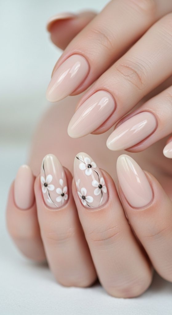 The floral elements in this design are usually delicate white petals with subtle golden or light brown centers to complement the neutral base. This keeps the design cohesive and soft while still adding visual interest. The focus is on proportion and spacing, ensuring each flower appears intentional and balanced. This idea is widely seen in Pinterest ideas boards because it blends modern design principles with traditional floral inspiration. It is also highly adaptable, allowing variations in flower size, placement, and shade intensity depending on personal preference and nail length.