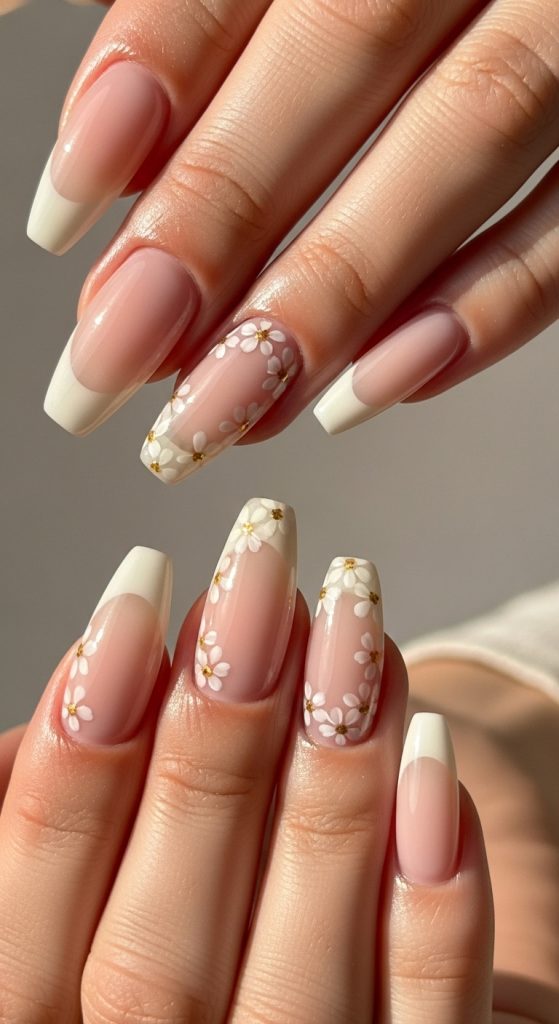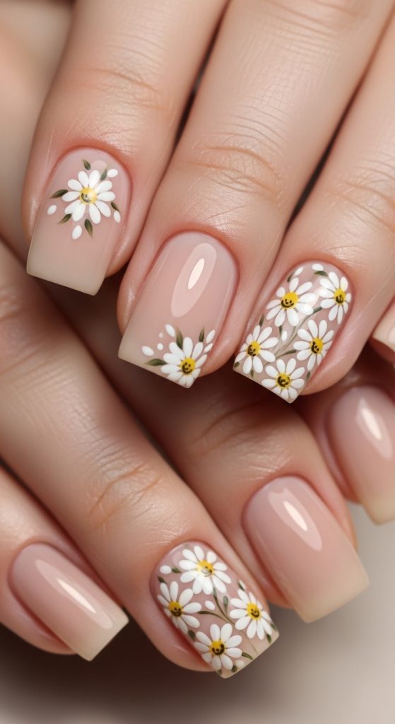 Idea 3: Nude Base with Tiny Daisy Clusters