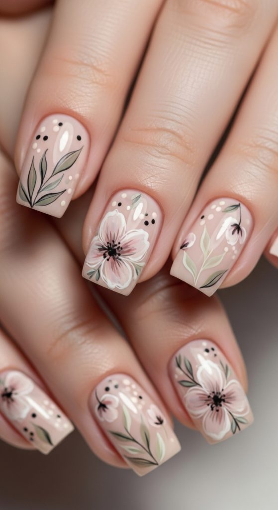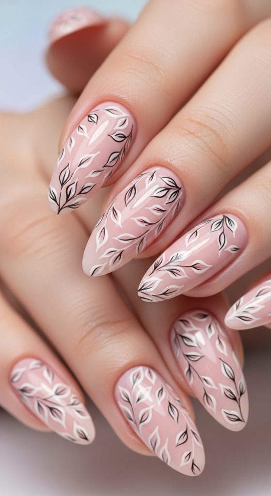 Begin with a soft pink base coat applied evenly across all nails. After drying, use a fine brush to add botanical shapes such as small leaves and petals. Keep the design light and spaced out to maintain balance.