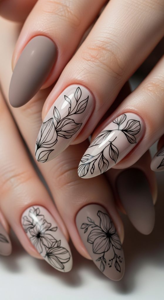 Idea 4: Taupe Floral Line Art Nails