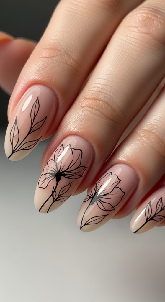 Idea 8: Minimal Black Line Floral on Nude Base