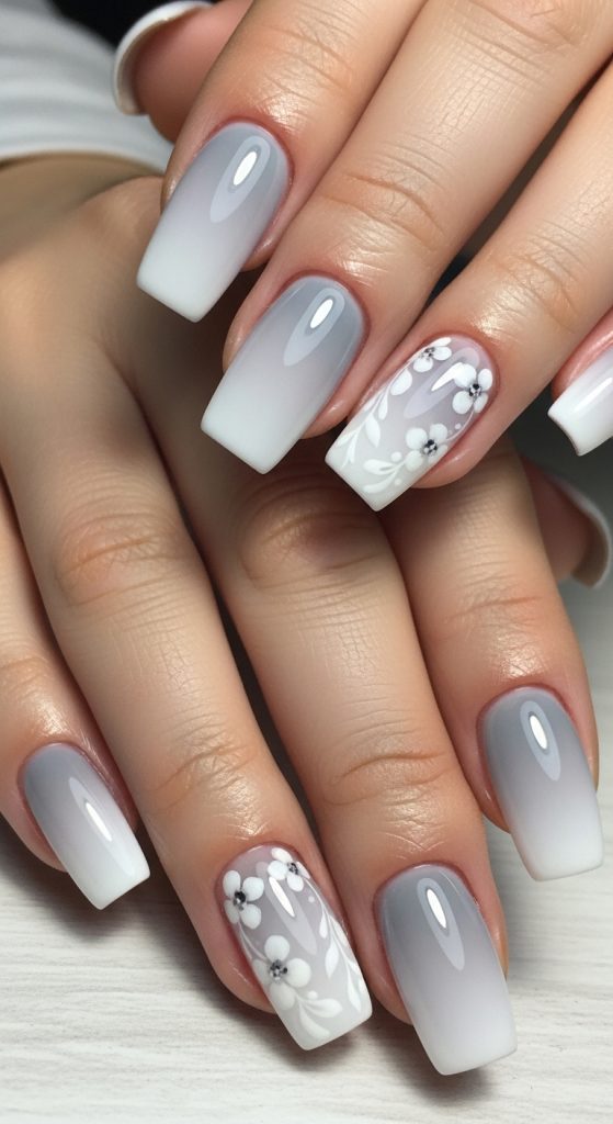 Idea 7: Grey Neutral Floral Gradient Nails