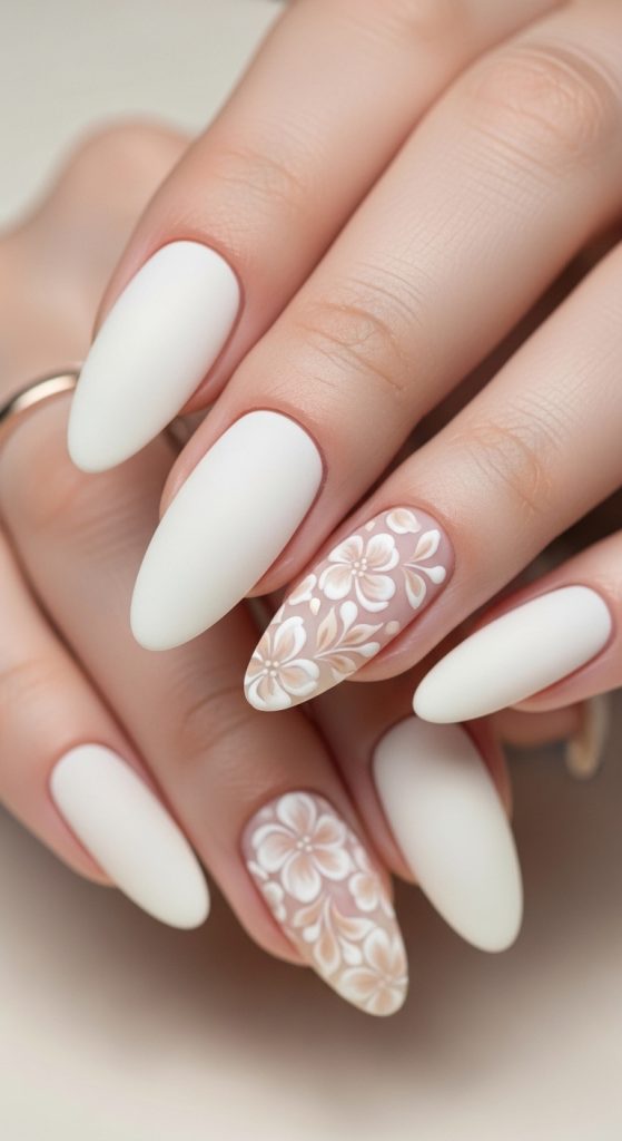 Idea 6: Ivory Matte Floral Elegance Nails