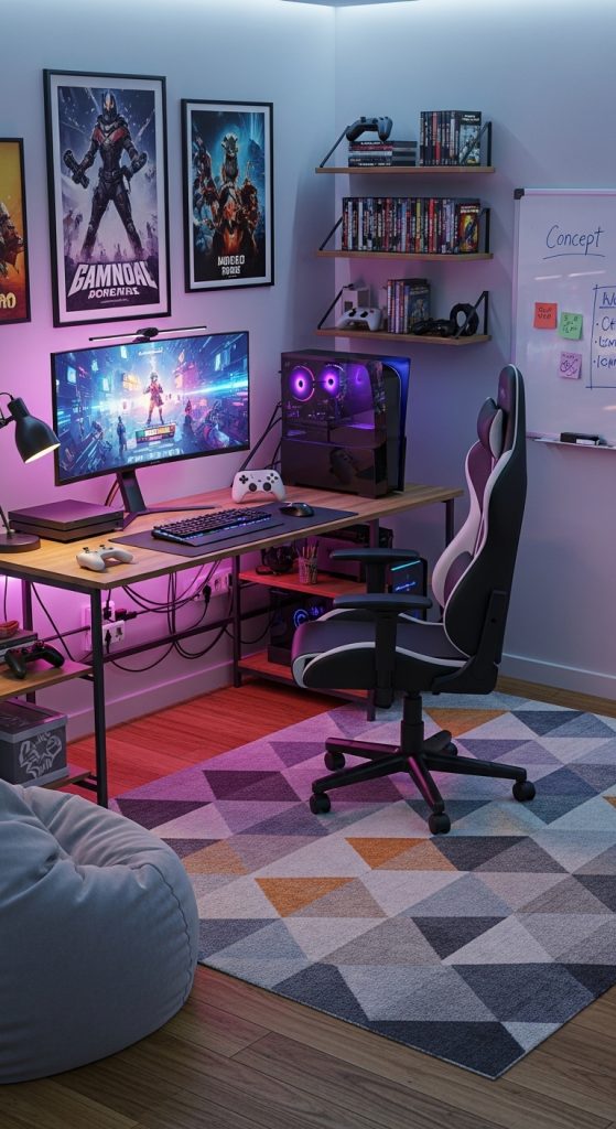 Consider storage for games, controllers, and headphones. Wall shelves or drawers can help keep everything organized. A soft rug or mat adds comfort while sitting on the floor for multiplayer gaming.