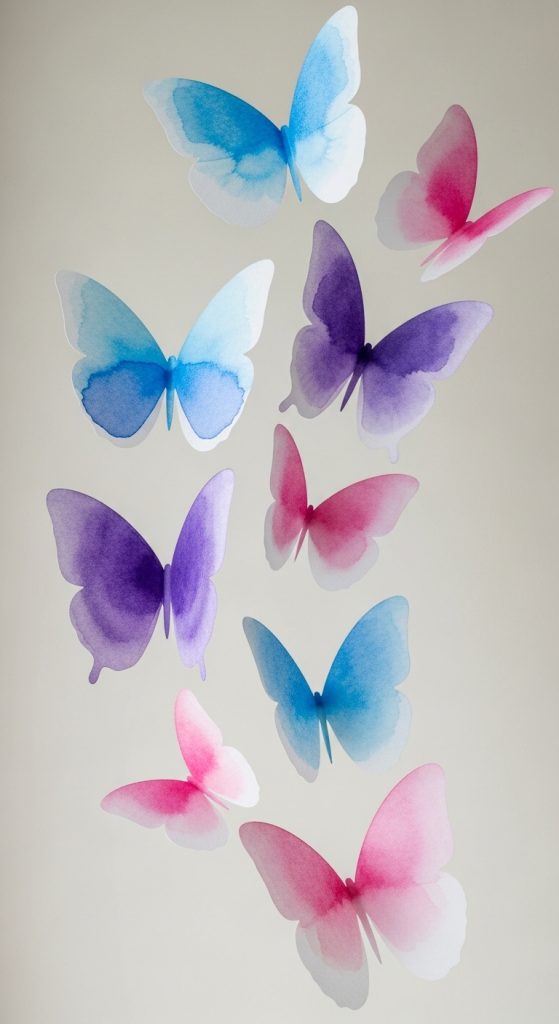 Watercolor gradient butterfly series designs focus on smooth color transitions that mimic natural fading effects found in artistic painting styles. This concept is widely used in Pinterest ideas because it combines softness with visual depth. The gradient effect is achieved by blending colors gradually across tissue paper surfaces, creating a seamless transition from one shade to another. This style is ideal for creative projects that aim to produce elegant and flowing visual arrangements. It works well in home decor settings where subtle artistic expression is preferred. The butterflies created through this method appear delicate and dynamic, giving the impression of movement. This technique also helps beginners understand color blending principles in a practical DIY tutorial format. The final result is suitable for wall displays, framed art pieces, or decorative installations.