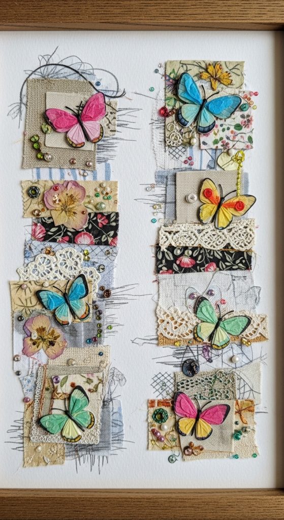 To create this design, prepare a frame base and arrange painted tissue paper butterflies along with additional decorative materials. Glue fabric accents or drawn elements to enhance composition. Layer butterflies at different depths to create visual hierarchy. Secure all elements within the frame carefully. This step-by-step process focuses on composition balance and mixed material integration.