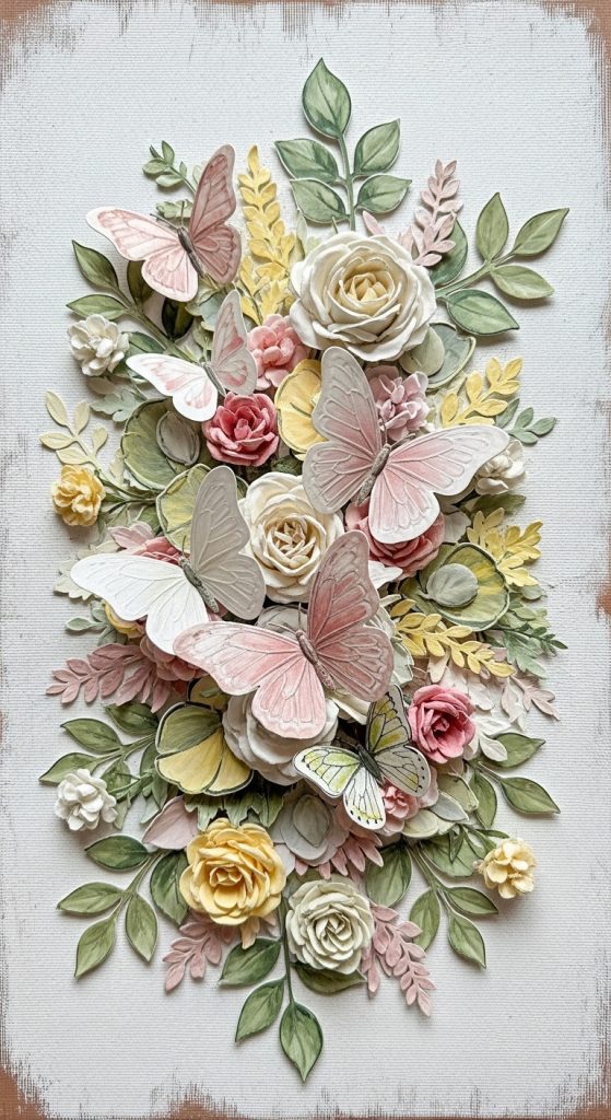 To create this design, prepare butterfly shapes and painted floral elements on tissue paper. Arrange them together on a base surface, ensuring balanced spacing. Layer flowers behind butterflies for depth. Secure all elements with adhesive. This step-by-step process emphasizes natural composition and visual harmony.
