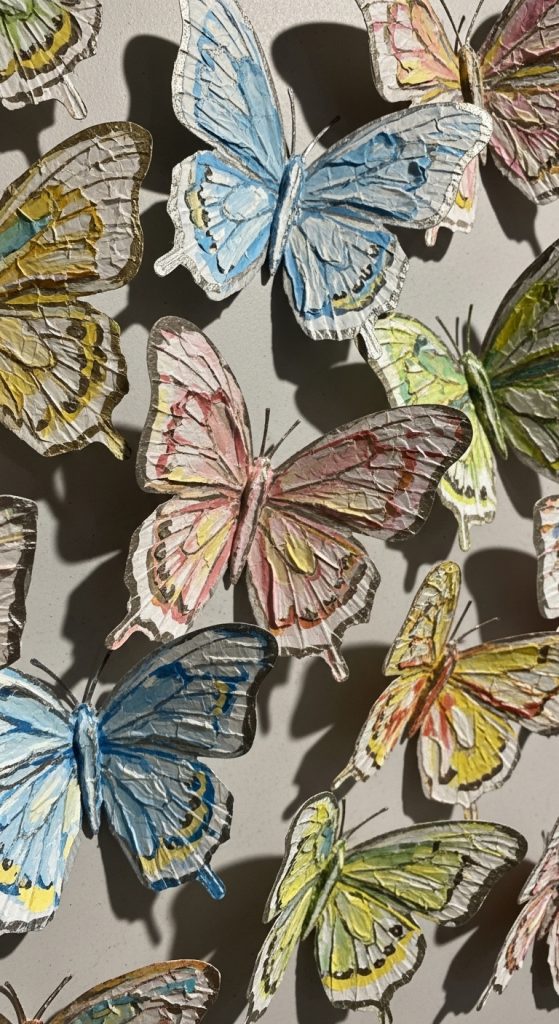 Textured tissue collage butterfly art emphasizes tactile depth by combining crumpled, layered, and painted tissue paper elements. This style is often used in creative ideas that focus on dimensional home decor and expressive handmade decoration. The texture plays a central role in defining the visual impact, making each butterfly appear sculptural rather than flat. This technique is suitable for beginners who want to explore creative projects involving material manipulation. It also aligns with modern design trends that value organic textures and layered aesthetics. The butterflies created through this method can be used in wall art installations or framed compositions. The irregular surfaces reflect light differently, adding visual interest and movement. This approach is ideal for DIY enthusiasts who want to experiment beyond flat paper designs.