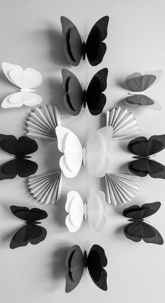 Minimalist monochrome butterfly art panels focus on simplicity and structured visual harmony using a single color palette. This design is popular in modern home decor due to its clean appearance and compatibility with minimalist style interiors. The concept involves using shades of one color, such as black, grey, or beige, to create subtle contrast within the butterfly shapes. This approach is ideal for those who prefer understated elegance rather than vibrant decoration. It also aligns with Pinterest ideas centered around organized and calming visual spaces. The design emphasizes shape clarity, symmetry, and balance, making it suitable for professional environments, study areas, or modern living rooms. The tissue paper texture adds softness to the otherwise structured monochrome theme, creating a refined handmade decoration effect. This method is especially effective for beginners who want simple yet sophisticated creative results.