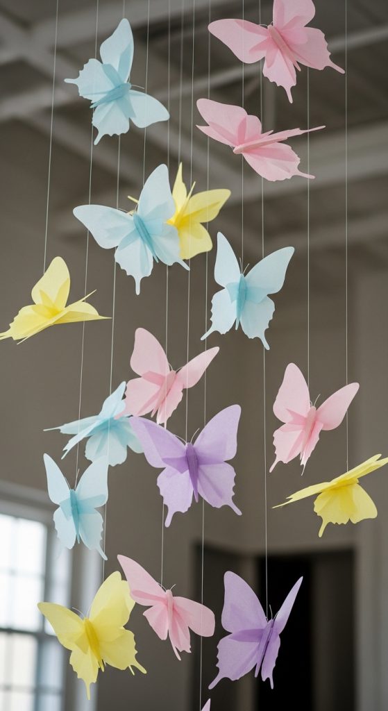 To create this installation, prepare lightweight butterfly structures using layered tissue paper. Attach thin strings or transparent threads to each piece. Hang butterflies at varying heights to create depth and motion. Ensure spacing is balanced for visual harmony. This step-by-step method focuses on spatial arrangement and structural stability.