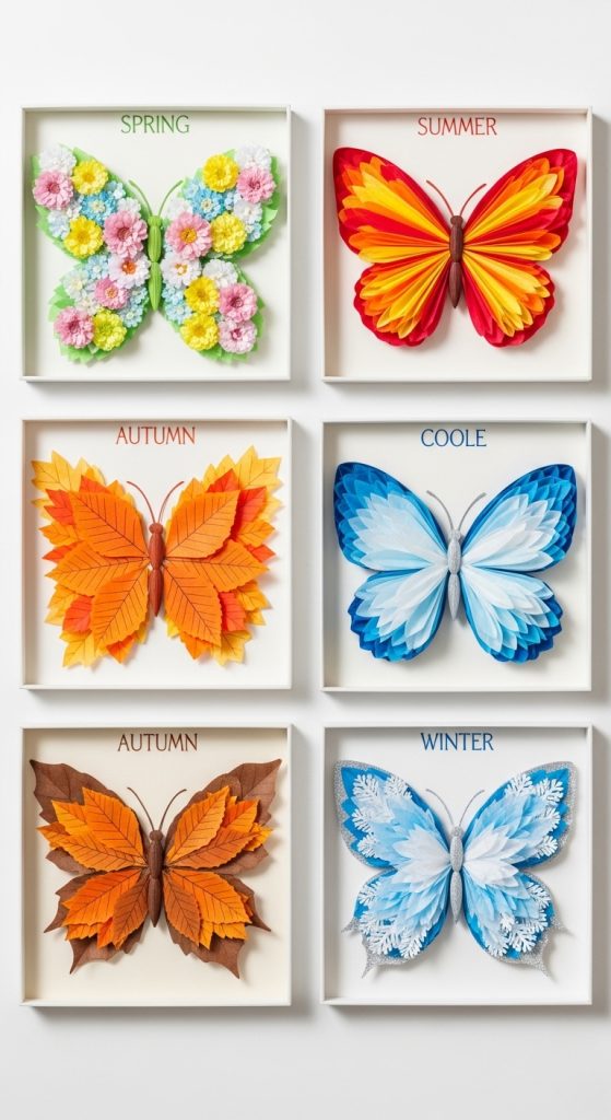 To create this design, assign specific color palettes to each season. Paint and cut tissue paper butterflies accordingly. Arrange sets separately or combine them into a seasonal timeline display. Secure each piece with consistent spacing. This step-by-step method encourages planning and thematic creativity.