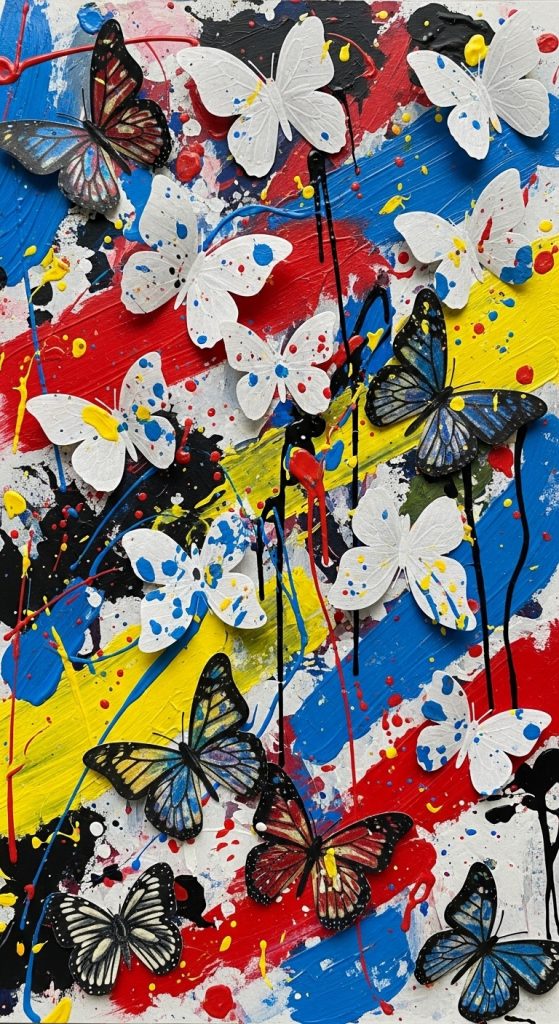 Bold color splash butterfly collages focus on high-contrast visual expression using vibrant paint combinations applied directly onto tissue paper surfaces. This style is often seen in Pinterest ideas that emphasize energetic and artistic freedom. The main concept is to create butterflies that stand out through intense color variation and dynamic brush techniques. Unlike soft pastel designs, this approach embraces unpredictability and expressive patterns. It is suitable for creative projects that aim to enhance home decor with strong visual impact. The collage format allows multiple butterflies to be arranged together, forming a cohesive decorative piece. This method is especially appealing for modern design lovers who prefer bold artistic statements. It also works well for classroom displays, art corners, and handmade decoration boards. The final result produces a lively composition that draws attention and highlights individual creativity.